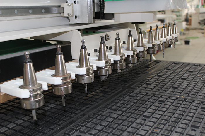 拉米諾數(shù)控排鉆開料加工中心,主要用于板式家具生產(chǎn)的鉆孔、銑槽、切割加工和櫥柜門板的雕刻、銑形加工。這款機(jī)器配置了9KW自動(dòng)換刀主軸和大容量刀庫(kù),可以解決各種復(fù)雜生產(chǎn)工序,同時(shí)機(jī)器還配置了排鉆組和四軸鋸,能夠高效率解決板式家具三合一、二合一連接件所需安裝孔及拉米諾、木得易、U型扣等隱形連接件所需安裝槽,是目前所有開料機(jī)機(jī)型中功能全面,效率極高的一款機(jī)型。
