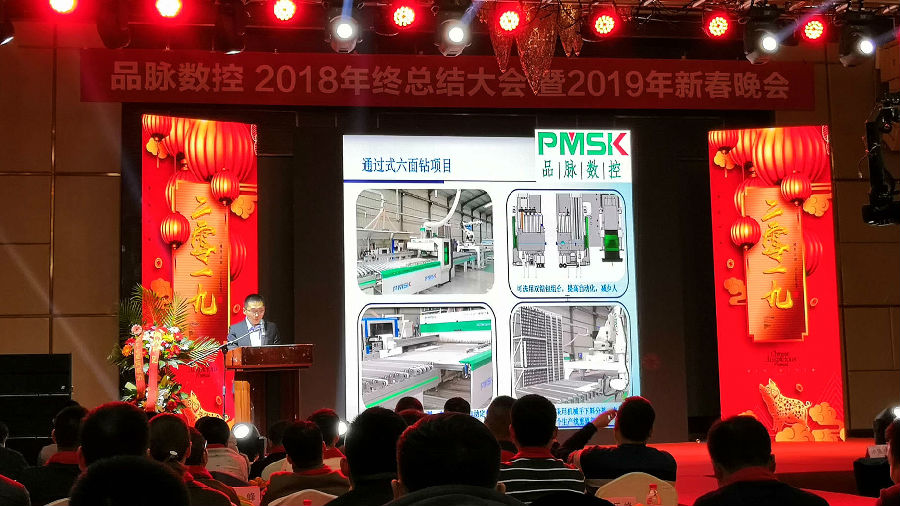 研發(fā)部李亮總工做工作匯報,2018年品脈數(shù)控有實木五軸加工中心、實木開料機(jī)、通過式六面鉆等新產(chǎn)品面世,并作出2019年的研發(fā)規(guī)劃。